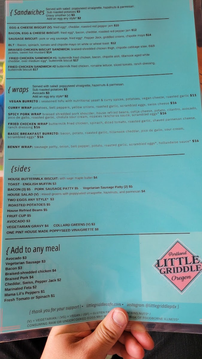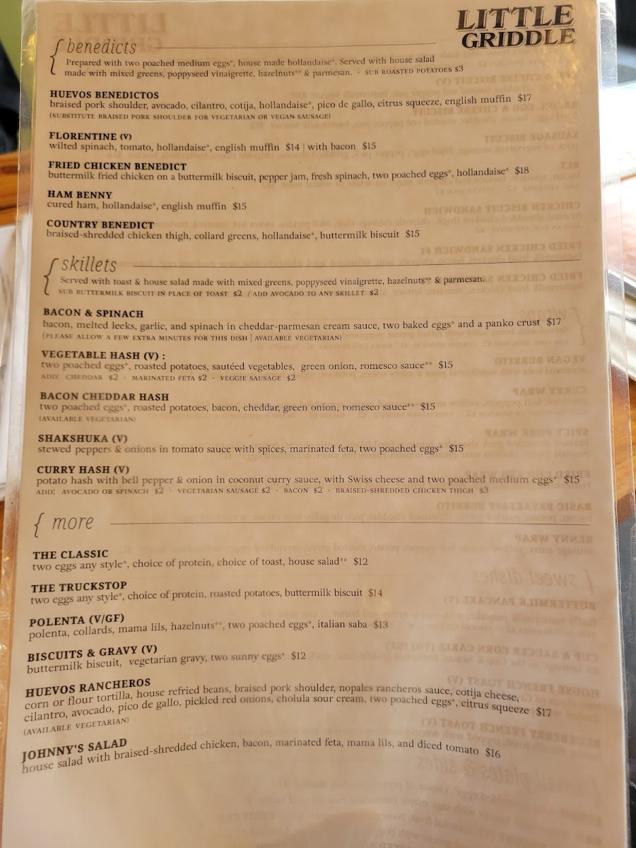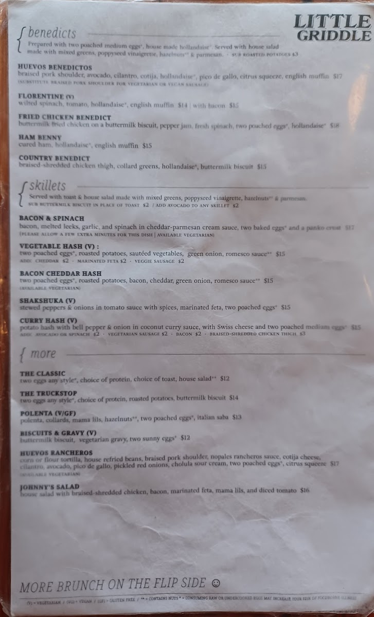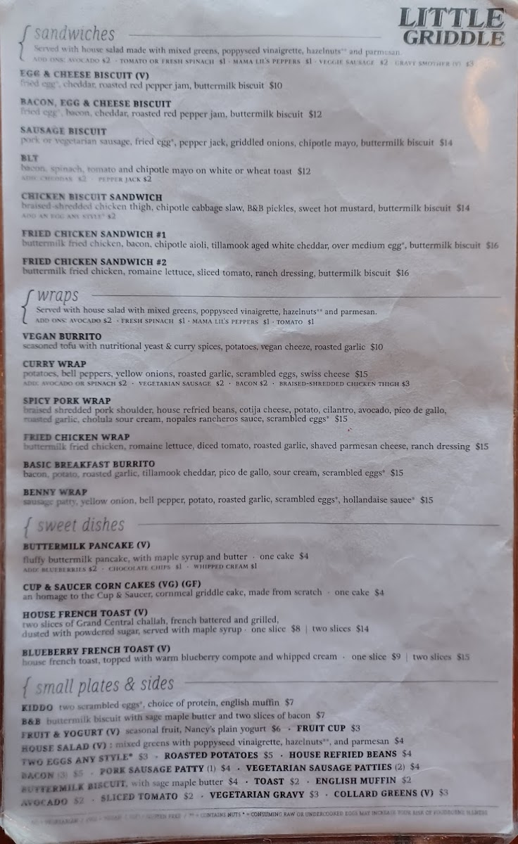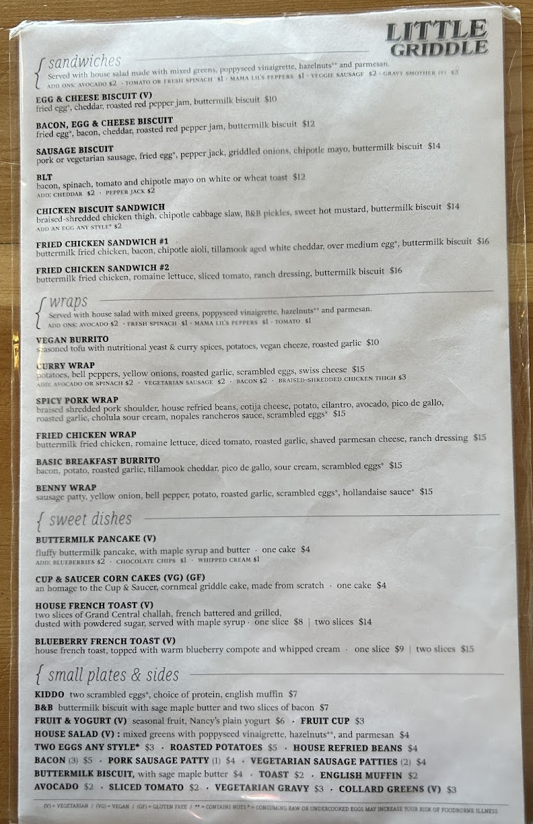 In conclusion, Little Griddle offers a wide-ranging menu with everything from savory to sweet, and from hearty meals to light refreshments, all at affordable prices. Whether you're in the mood for a classic breakfast, a refreshing drink, or a delicious wrap, this restaurant has something for everyone.