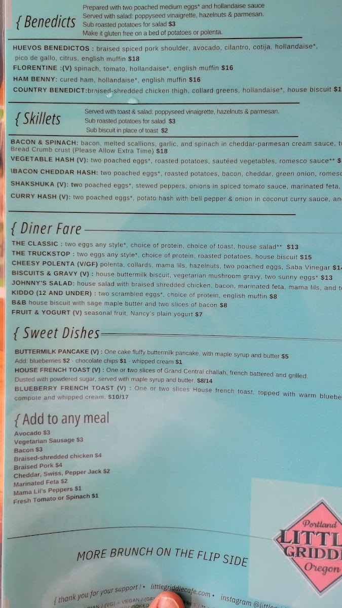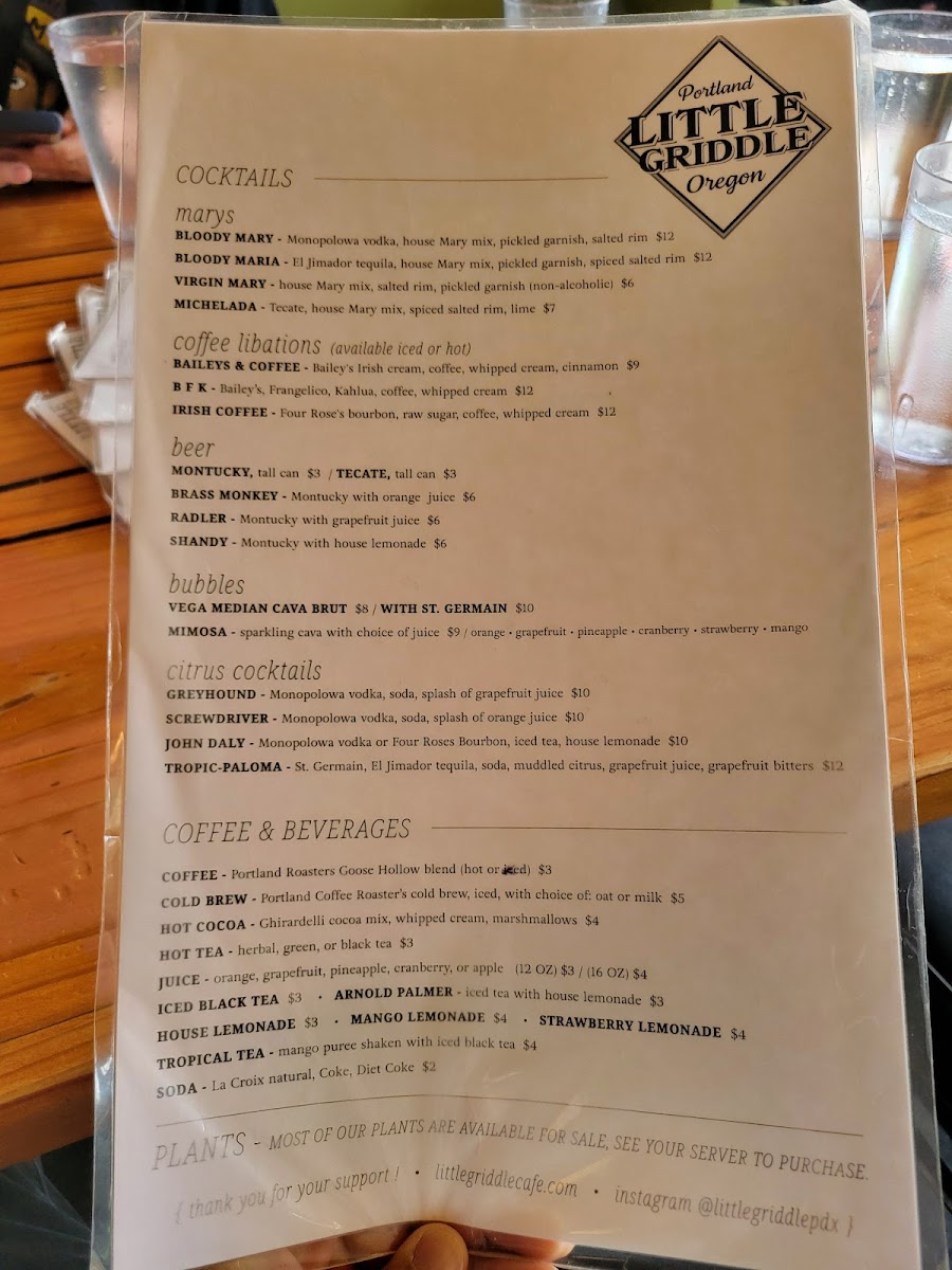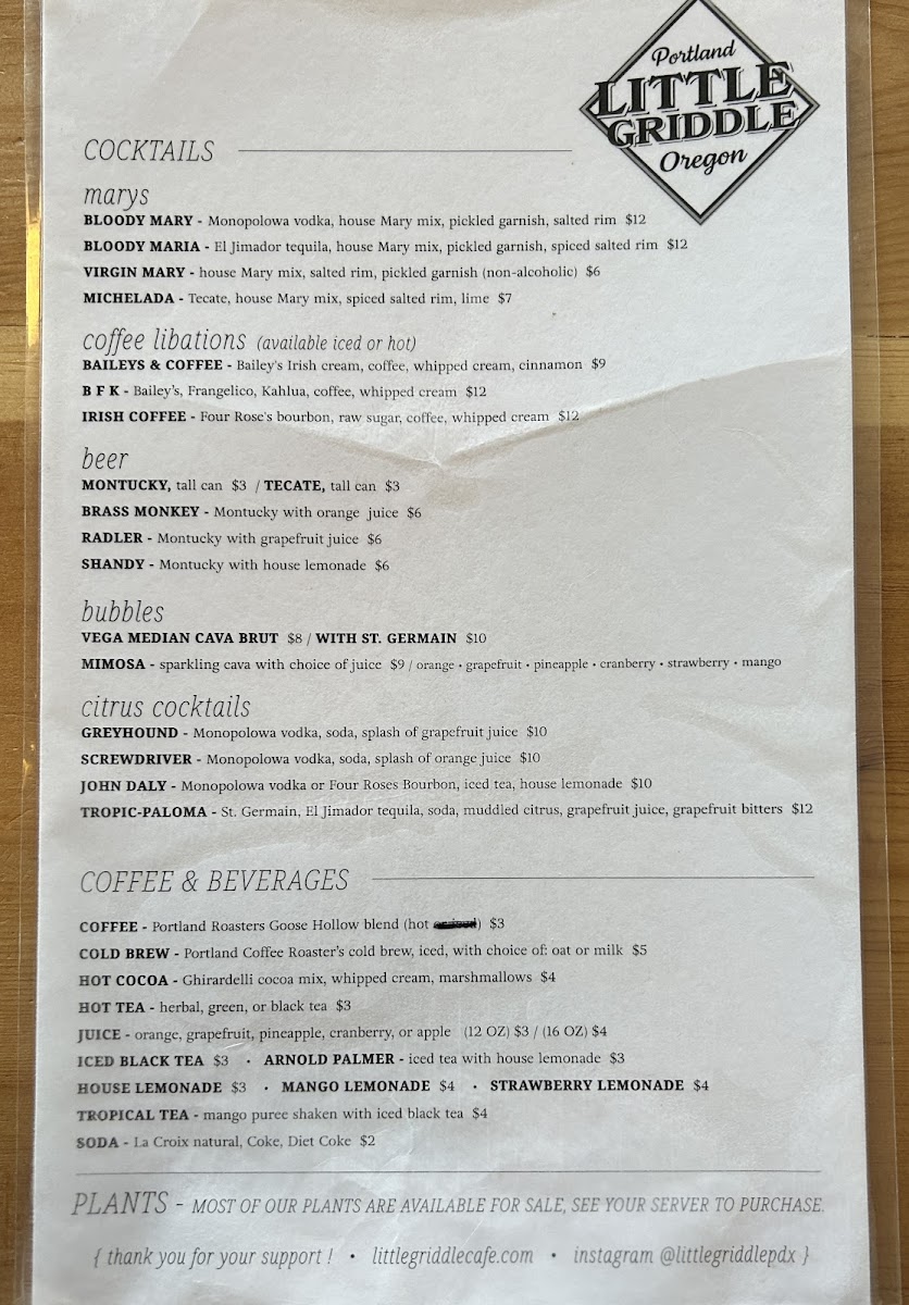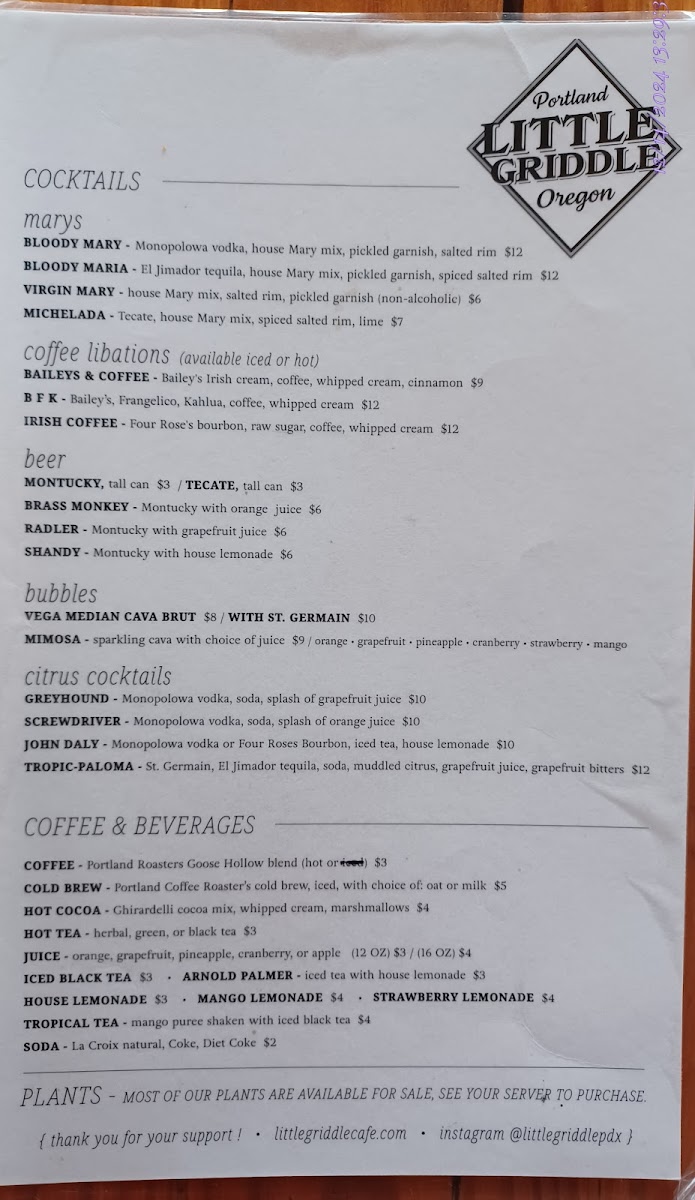 Little Griddle, located at 3566 SE Hawthorne Blvd, Portland, OR, offers a diverse and delicious menu that caters to a wide range of tastes, perfect for any time of the day. For those craving a light kickstart, the Marys menu features refreshing drinks like the Virgin Mary and Michelada. If you're in the mood for something warm, the Coffee Libations section offers comforting options such as the classic Baileys & Coffee and the hearty Irish Coffee.
